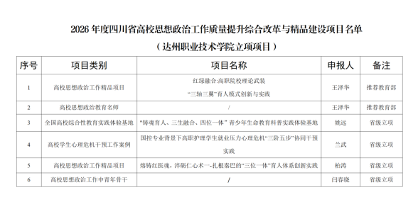 近日,四川省教育厅公布了2026年度四川省高校思想政治工作质量提升综合改革与精品建设项目立项名单,我校6个项目获得立项,其中2个项目拟推荐至教育部。入选总数创学校历年新高,位居全省高职院校前列,标志着我校在深化思想政治工作改革创新、提升育人实效上取得了扎实的阶段性成果。